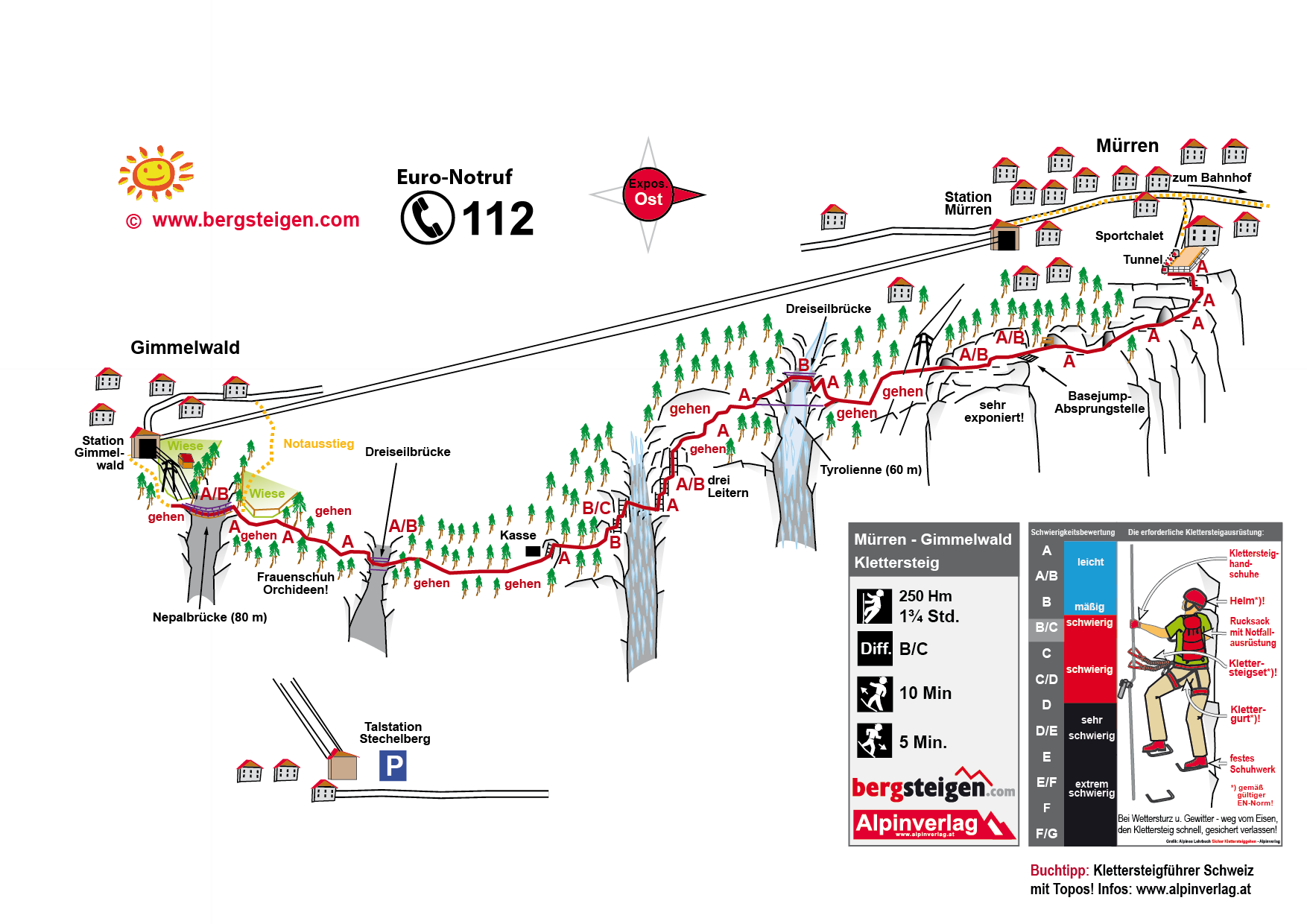 The Mürren-Gimmelwald via ferrata route is a climb that takes you high above the Lauterbrunnen valley, between the car-free villages Mürren and Gimmelwald. The climb is rated B/C and has a total vertical distance (mostly descent) of 250 meters. The ferrata itself takes about 1 hour and 45 minutes to complete, while the approach takes 10 minutes and the descent 5 minutes.