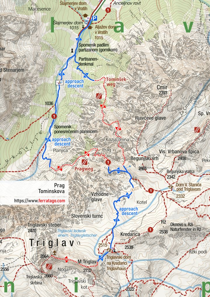 Descent is on the same route or, in the lower part, you can use via ferrata Tominškova pot (B, 1) instead of Prag. Other combinations for a multi-day tour are also possible.